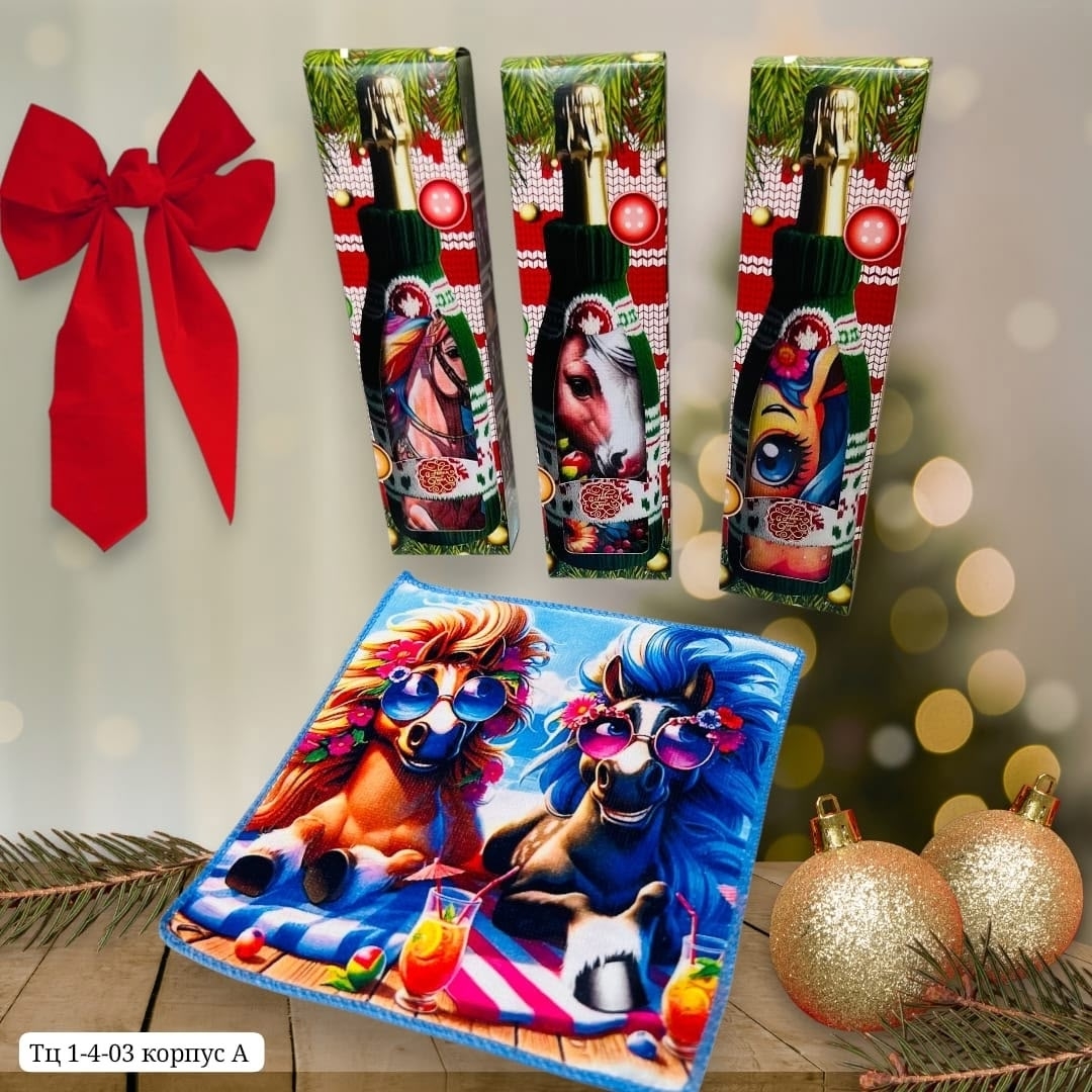 [1 шт] Полотенце из микрофибры 25х25см с лошадкой. Коробка в виде бутылки. Подарок на новый год!!!