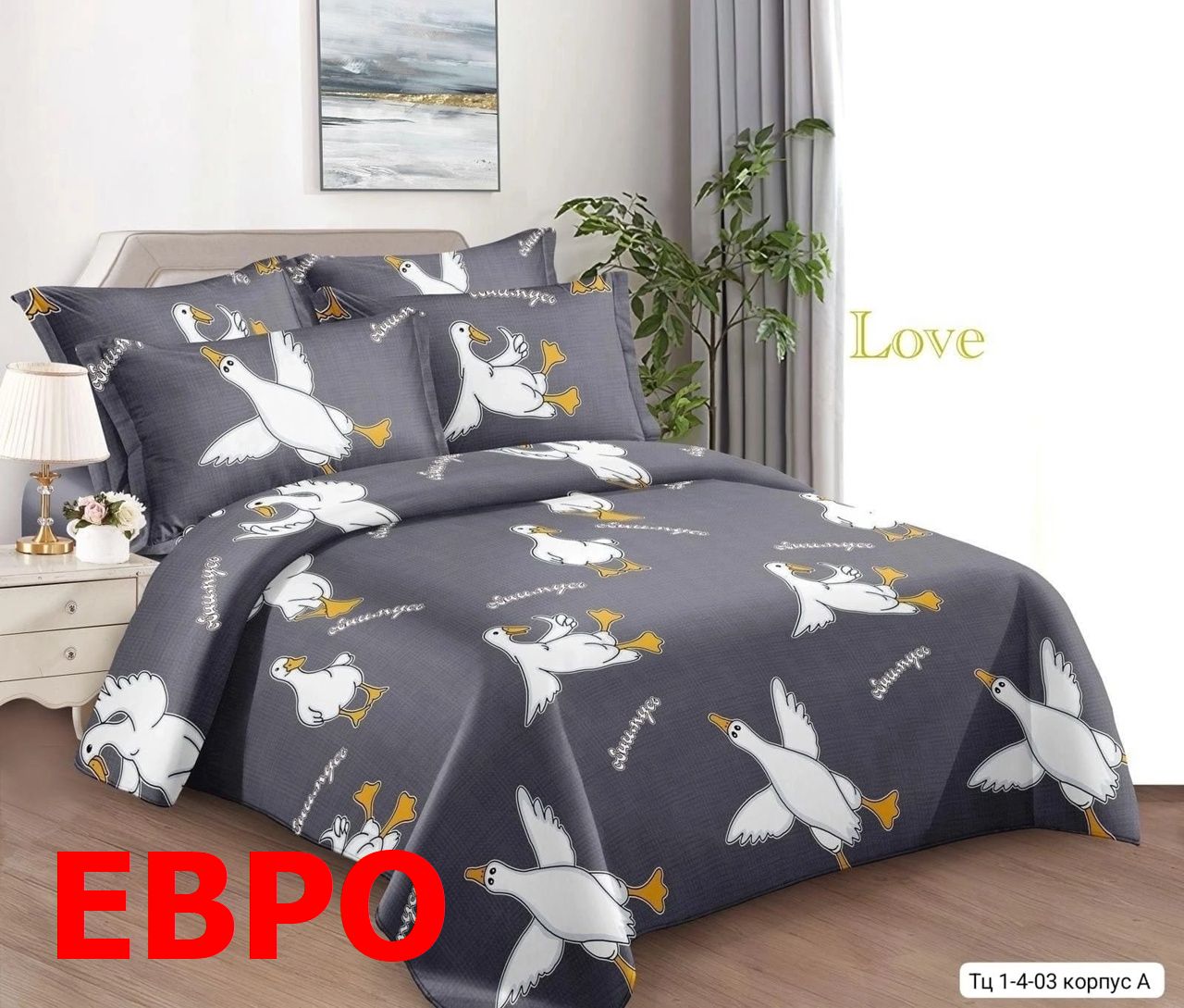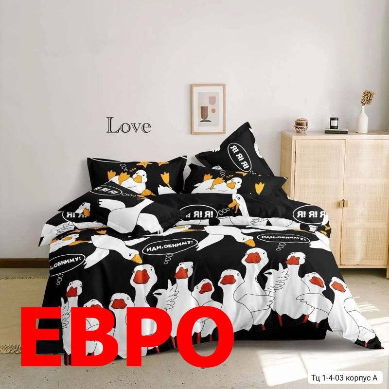 ЕВРО комплект постельного белья 'Гуси. Обнимусь' . Ткань: поплин